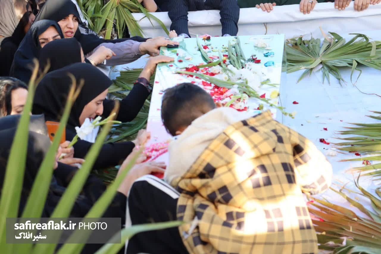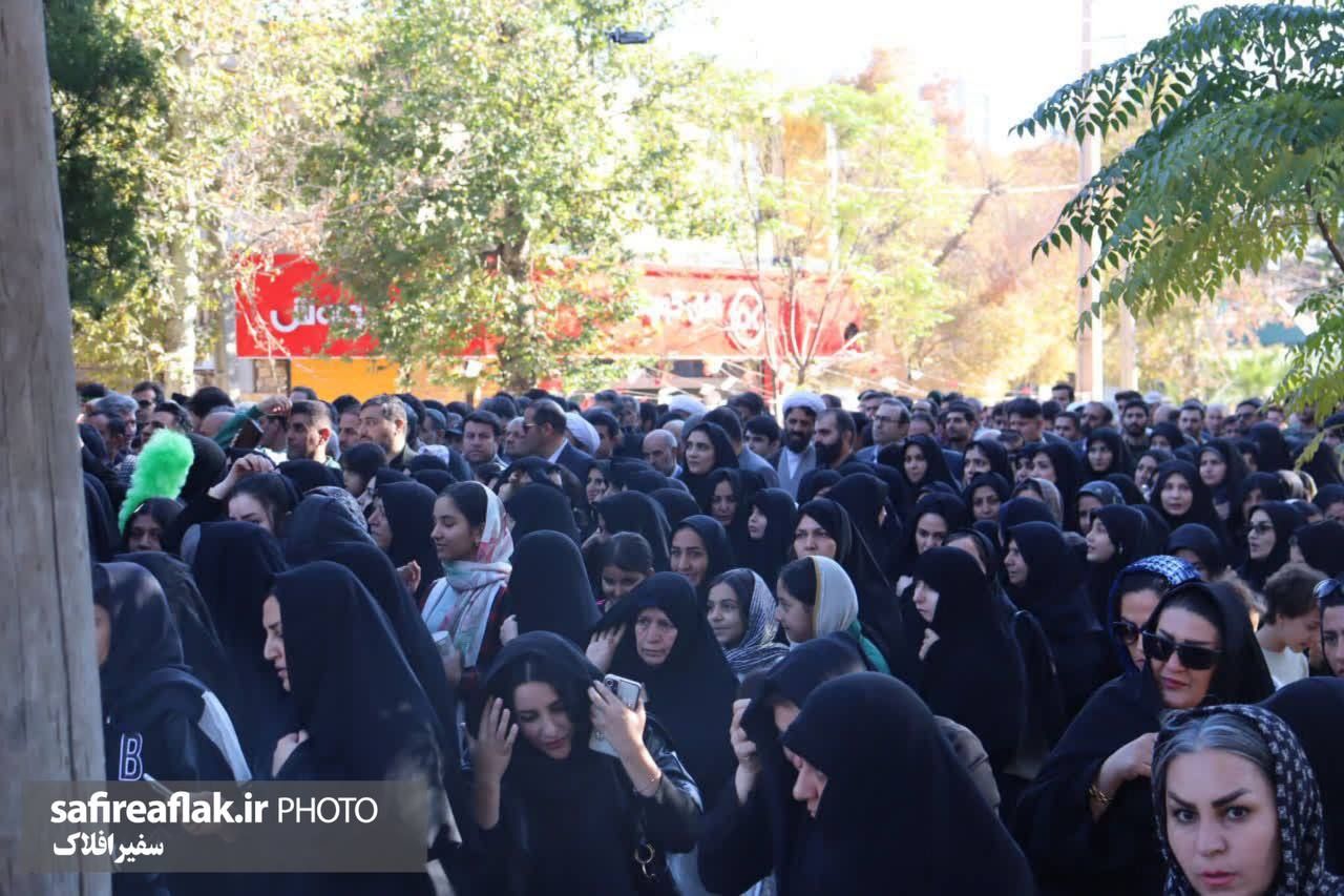 صدای «صلوات» در فضا میپیچید و با هر زمزمه، اشکهای تازهای از گونهها جاری میشد. نوجوانانی با لباس بسیجی پرچمهای کوچک در دست داشتند و دختران کوچک گلهایی سفید بر مسیر تابوت میریختند.