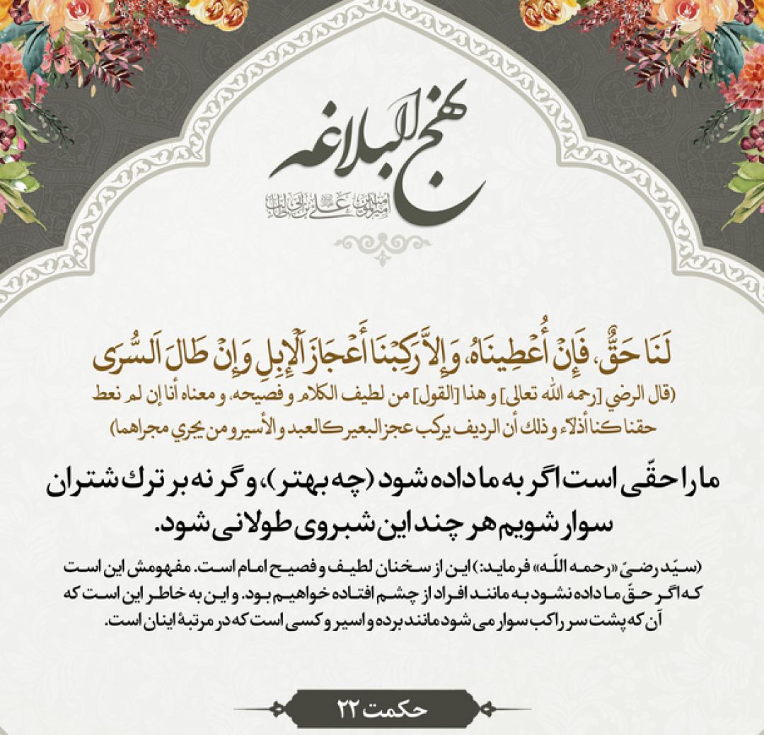 وَ قَالَ علی (علیهالسلام): لَنَا حَقٌّ، فَإِنْ أُعْطِينَاهُ، وَ إِلَّا رَكِبْنَا أَعْجَازَ الْإِبِلِ وَ إِنْ طَالَ السُّرَى.